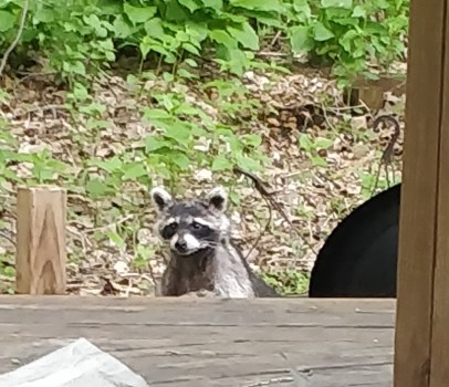This racoon has been living under my deck for a couple of weeks. Seems to be getting bolder and is quite used to our comings and goings. She’ll probably give birth soon an then move-on with her brood as soon as they are big enough.